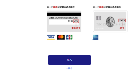 VISA、MasterCard、JCB、アメリカン・エキスプレスが使えます