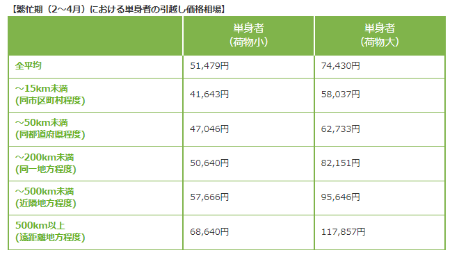 繁忙期といわれる【2月から4月】の単身者の引越し価格相場になります