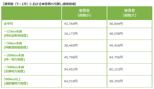 通常期の【5月から1月】 単身者の引越し価格相場になります