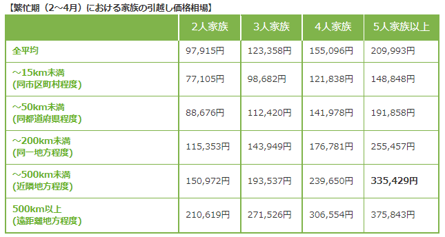 繁忙期といわれる【2月から4月】 家族の引越し価格相場になります