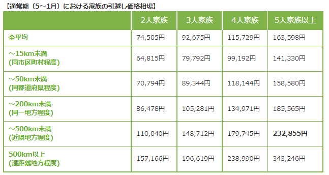 通常期の【5月から1月】の家族の引越しの価格相場になります